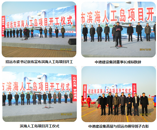 2014年12月29日10點08分,中港建設(shè)集團舉行了濱海人工島項目開工儀式。山東省招遠(yuǎn)市領(lǐng)導(dǎo)張偉、王光耀、林建東、徐林宏、郝永平、趙曙光、馬立海等市級領(lǐng)導(dǎo)班子成員,中港建設(shè)集團成標(biāo)董事長、秦高舉副董事長、崔大凡副總裁、黃波副總裁等集團高管,總承包單位中國技術(shù)進(jìn)出口公司相關(guān)負(fù)責(zé)人,招遠(yuǎn)市各鎮(zhèn)主要負(fù)責(zé)人,及人工島指揮部成員、各有關(guān)單位一同參加開工儀式。