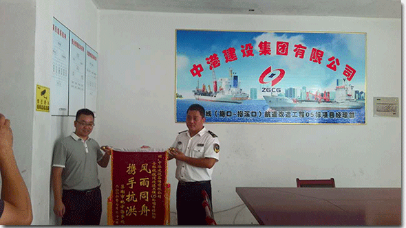2016年8月12日下午13:00,巢湖市地方海事處通航科何科長、安全科王科長等一行三人到中港建設集團有限公司-合裕線航道改造工程05標項目部駐地頒發(fā)防汛救災表彰錦旗。
